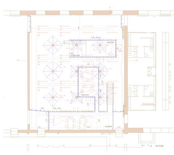 La biografía de Borrego aflora en las soluciones más sencillas. Las horas pasadas en el estudio de Alejandro de la Sota, donde tuvo su primer trabajo, aparecen en los elementos absorbentes de sonido, realizados con goma-espuma. También la idea de emplear restos del pino –obtenidos de aligerar la estructura en la segunda planta en la que los pilares no precisaban tanto grosor- sirvieron para construir el soporte de las luminarias. El trabajo es low tech y, sin embargo, de alto ingenio. El resultado: 120 puestos de trabajo en 400 metros cuadrados, levantados en pocos días y construidos en seco con materiales reciclables. Se trata de un espacio que quiere invitar a trabajar, a atreverse a pensar de otra manera, a desprejuiciarse y a colaborar. Adaptarse, no conformarse, responder y no dejarse vencer por el peso del puesto como profesor, esa es la lección de este profesor de proyectos de la ETSAM.