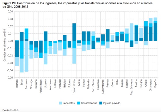 Fuente:Los niños de la recesión. Report Card 12 de UNICEF. El gráfico muestra la contribución de los ingresos privados y públicos al incremento o reducción de la desigualdad (medida según el índice de Gini).