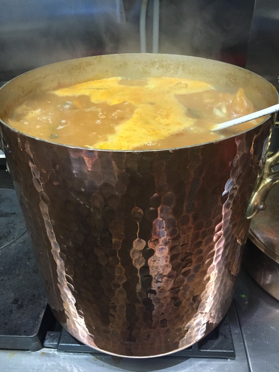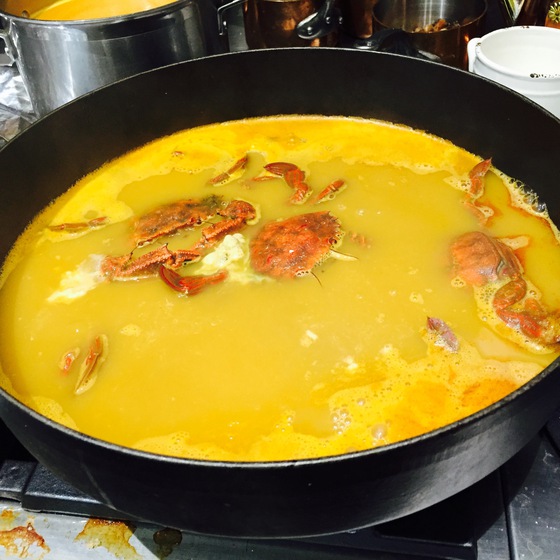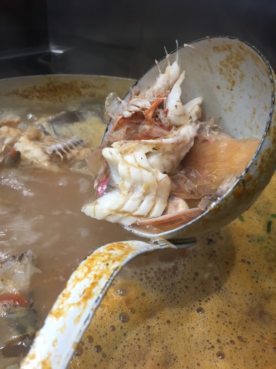 En el fregadero de la casa, repleto de hielo picado, había amontonado pescados y mariscos de grandes tallas. Dentro de una de las ollas de cobre hervía caldo de pescado a borbotones. “Es la batería de Santi Santamaría, se la compre a la familia después de que cerraran Can Fabes”, me dijo. Cuando le pregunté como había iniciado la bullabesa me respondió enseguida: “Primero un sofrito de cebolla, tomate, zanahoria, puerro, ajo y bulbo de hinojo, al que he añadido agua y vino blanco además de pescados y mariscos pequeños”.