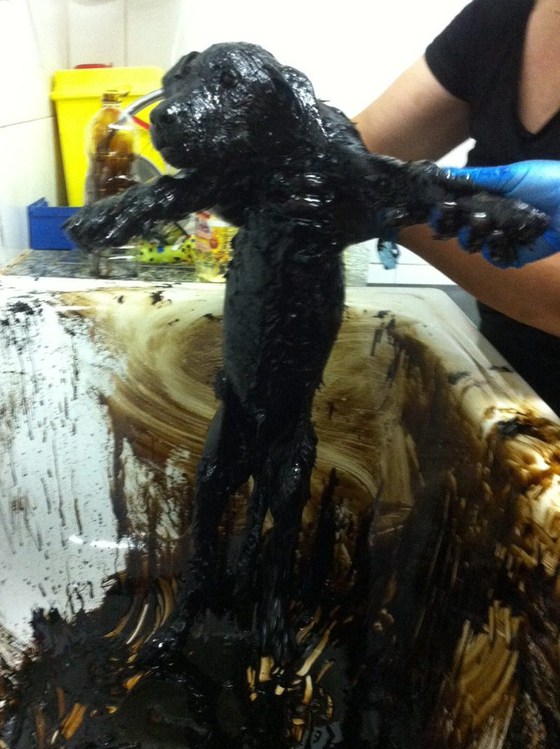 Mientras llevaban a los animales a la clínica de Nieves, la veterinaria de la zona, llamaron a la responsable de Medio Ambiente de la Federación de Asociaciones de vecinos de Cartagena para saber cómo limpiar a los animales en estos casos. A su vez, estos se pusieron en contacto con compañeros de Galicia, muy duchos -a su pesar- con todo lo relacionado con el chapapote. Diagnóstico: muchos lavados con aceite de girasol y lavavajillas neutro.