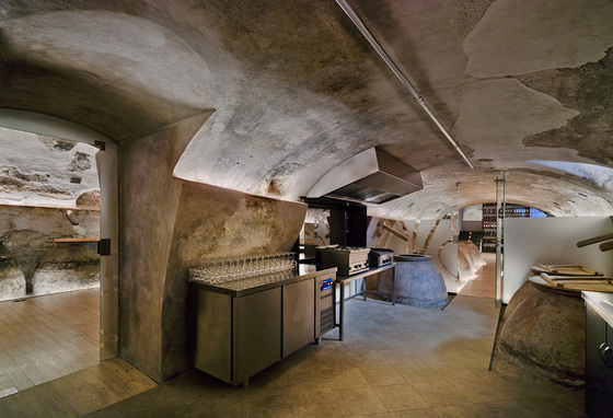 López ha hecho visible la antigua bodega en el suelo del acceso a las aulas y junto a un paramento de vidrio. Los muros laterales, ahora restaurados, incluyen los canales y los conductos de madera que sirvieron para la distribución y el vertido del vino. Todo ese pasado puede verse sigilosamente, casi sin que él se enfrente al visitante, gracias a la iluminación, proyectada de forma rasante y ascendente sobre la bóveda, que logra una atmosfera limpia.