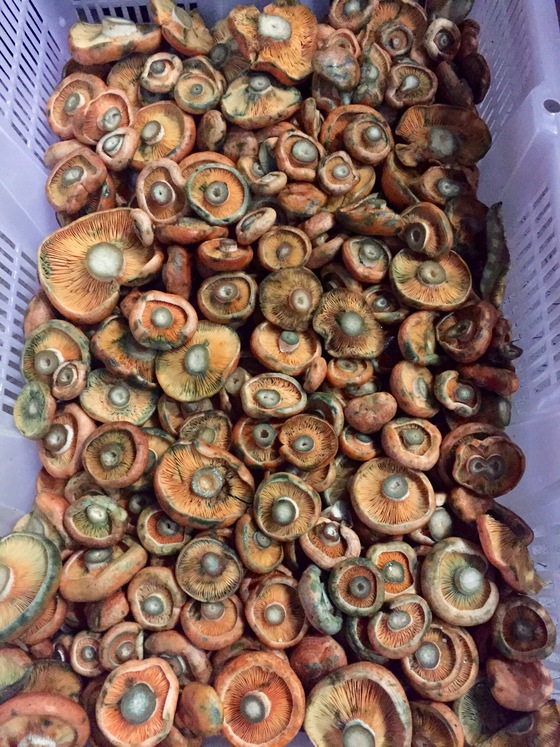 Antes de marcharme, Eduardo y Álvaro me mostraron sus setas del día. Cajas con níscalos, angulas de monte, rebozuelos, trompetas de la muerte, hongos boletos, setas de cardo, tricoloma terreum, senderuelas y amanitas cesáreas. Un verdadero alarde.