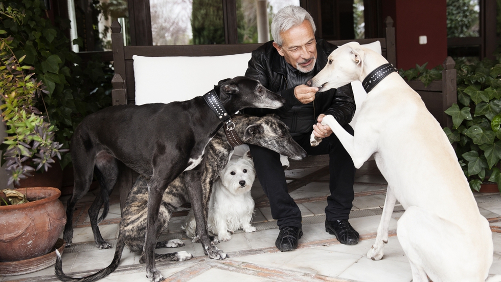 Sus tres galgos son también “bailarines, por su elegancia y tranquilidad”. Conoce bien la personalidad de cada uno. Lao es el más fuerte, Uma es la princesa y Fueté es la mimosa. “La iban a sacrificar en la perrera y la adopté”. Pero la que lo acompaña en sus giras por el mundo es Alhambra, “la más revoltosa”. A pesar de su pequeño tamaño, esta westy no se deja amedrentar por los otros perros de la casa y “les incita para que jueguen”.