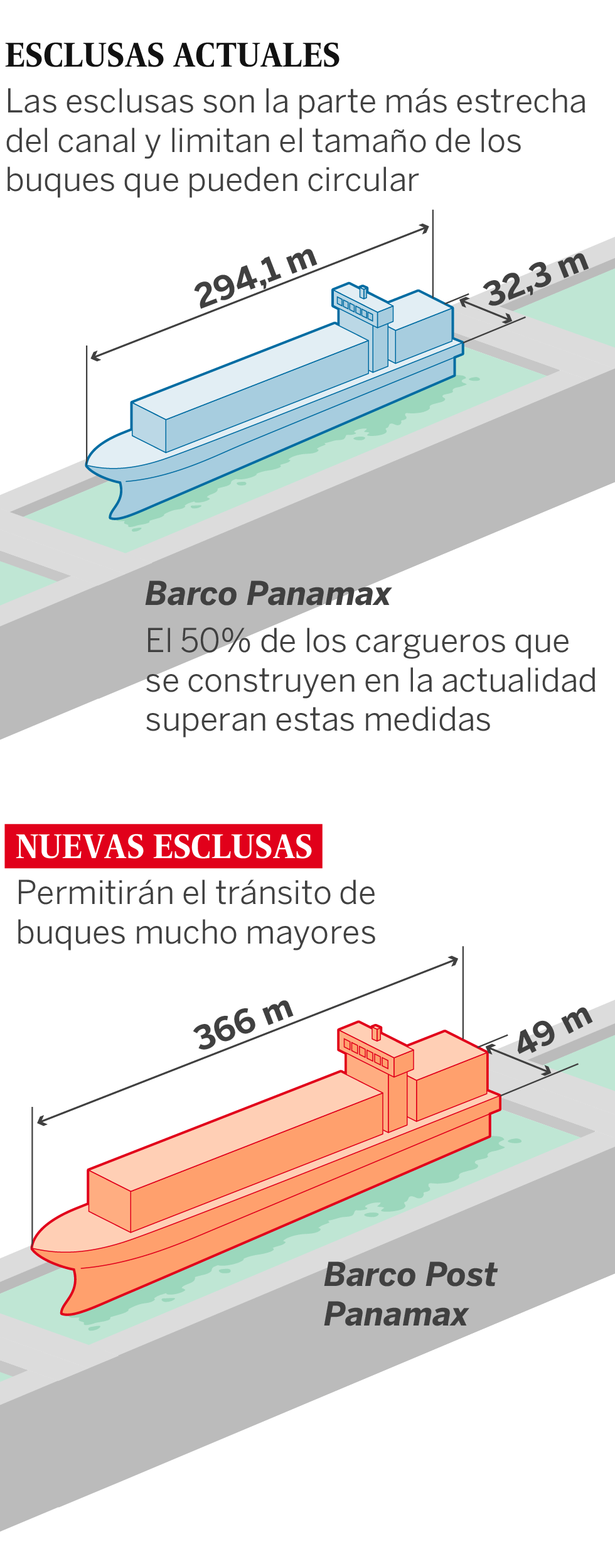 Las esclusas son la parte más estrecha del Canal. Las nuevas permitirán el tránsito de los nuevos cargueros, apodados "post panamax".