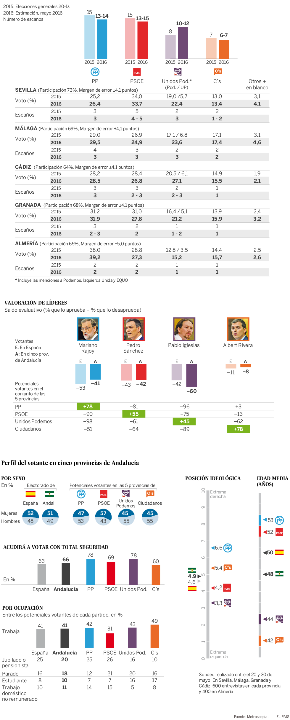 Estimación de resultados y valoración de líderes en Sevilla, Málaga, Cádiz, Granada y Almería