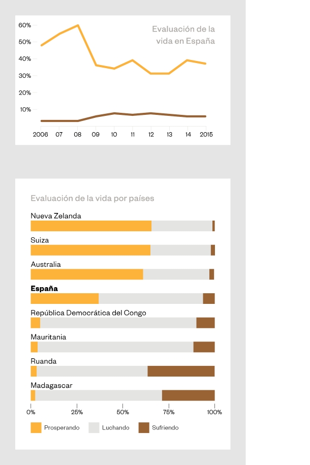 De manera general, las personas con mayores ingresos, las que tienen empleo a tiempo completo, las más escolarizadas, las más jóvenes, las mujeres, las solteras y las que viven en zonas urbanas tienden a declarar mayores niveles de bienestar que el resto de la población. Pero, de nuevo, esos son indicadores globales. El asunto resulta más interesante cuando se analizan los datos por países. En España vemos que, en 2015, el 36,9% se calificó como “prosperando”, un notable descenso del pico (60%) que esa misma categoría alcanzó en 2008.