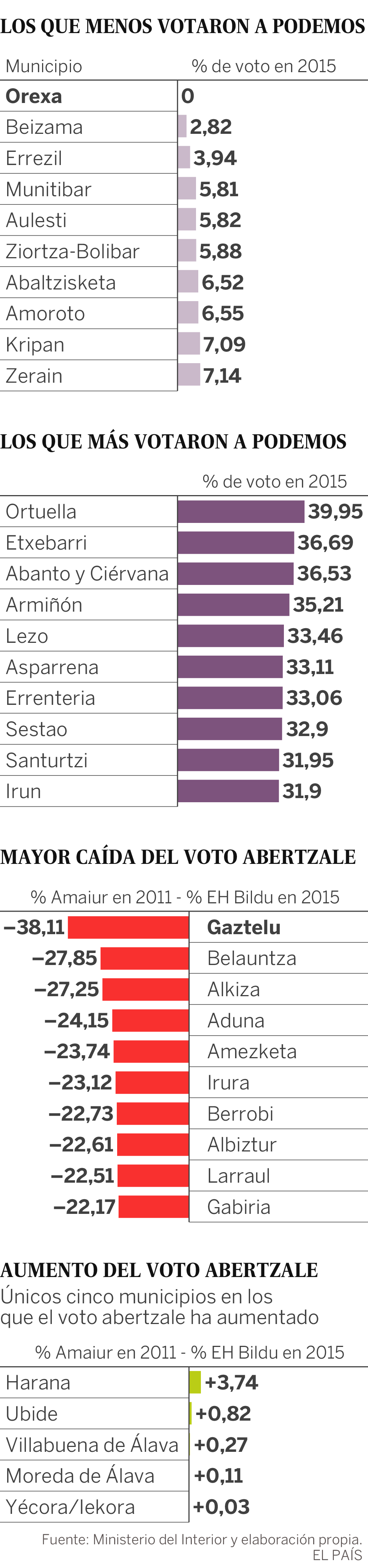 En casi todos los municipios vascos EH Bildu, la candidatura abertzale de 2015, ha obtenido menor porcentaje de votos que Amaiur, la candidatura de las elecciones de 2011. Gipuzkoa y el noreste de Álava son las zonas más castigadas. Solo en cinco poblaciones ha aumentado el % de voto abertzale.