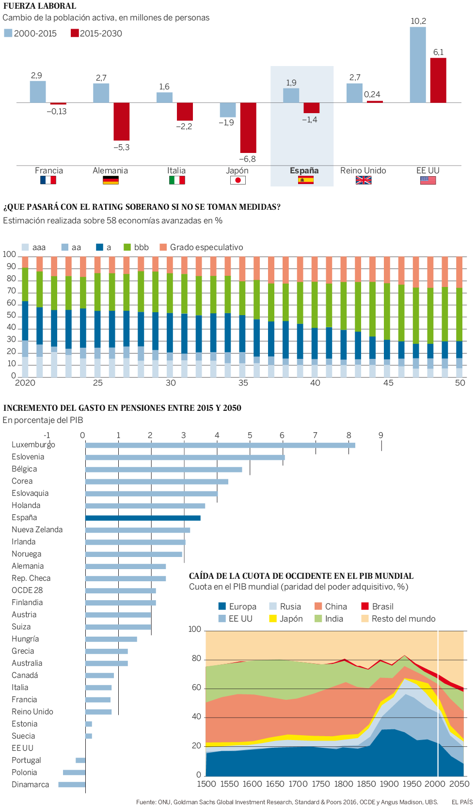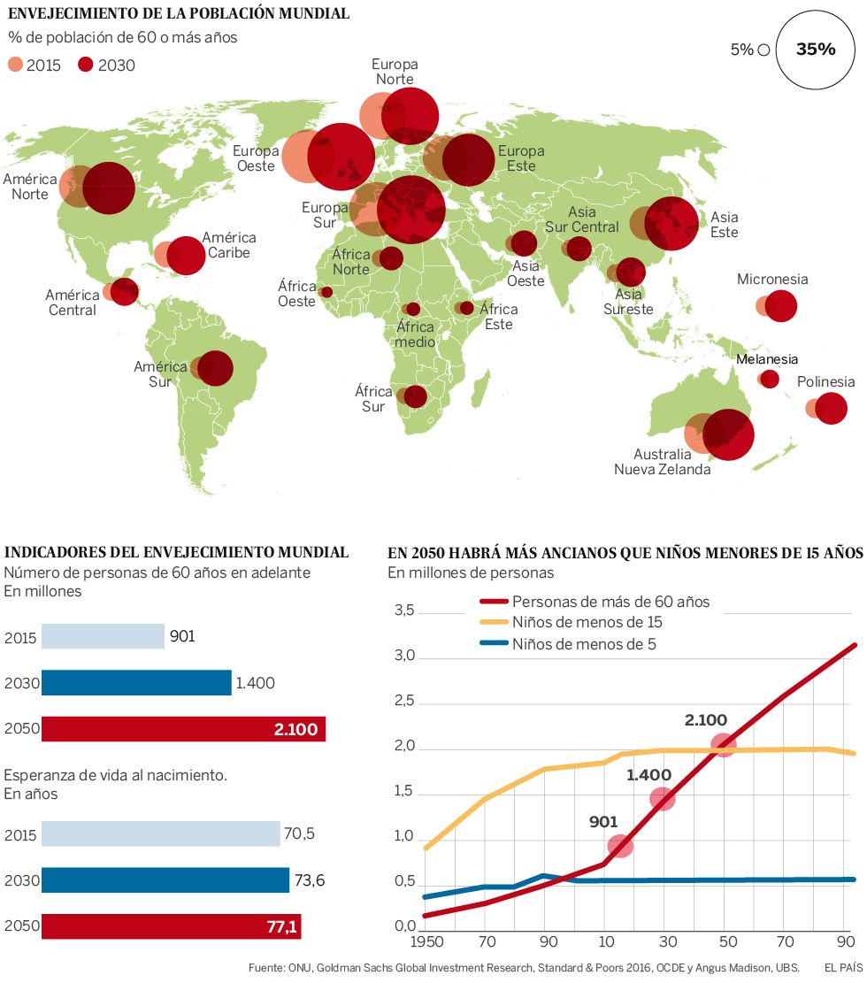 Las proyecciones señalan que el peso del colectivo de personas mayores de 65 años sobre la población mundial pasará del 9% en 2010 al 19% en 2050. Las demandas sanitarias van a aumentar y el gasto público en pensiones con respecto al PIB pasará del 9,5% en 2015 al 12% en 2050.