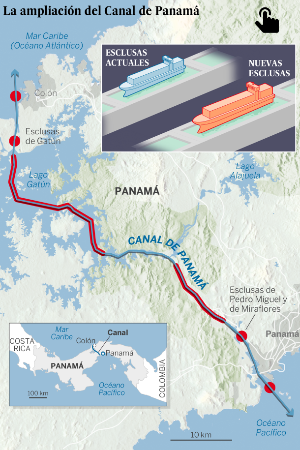La ampliación, que incluye otros trabajos además del nuevo juego de esclusas, permitirá aumentar el tránsito de mercancías de 330 a 600 millones de toneladas anuales. Eso se debe no tanto a que se incrementará el número de travesías de 12.000 a 16.000 como a que ahora podrán cruzar barcos mucho más grandes. El tamaño de los buques se define en función del canal de Panamá. Los panamax (máximo tamaño para cruzar el canal hasta ahora) pueden transportar hasta 4.500 contenedores. Los post panamax o new panamax podrán atravesar con cargas de hasta 12.500 contenedores. Además, las nuevas dimensiones permitirán su uso por parte de grandes cruceros de pasajeros, barcos gaseros o de transporte de carbón que hasta ahora no cabían.