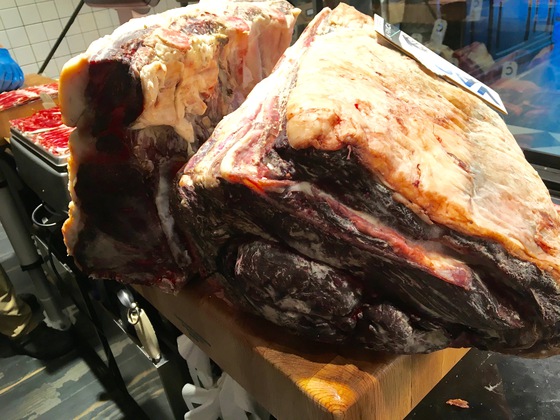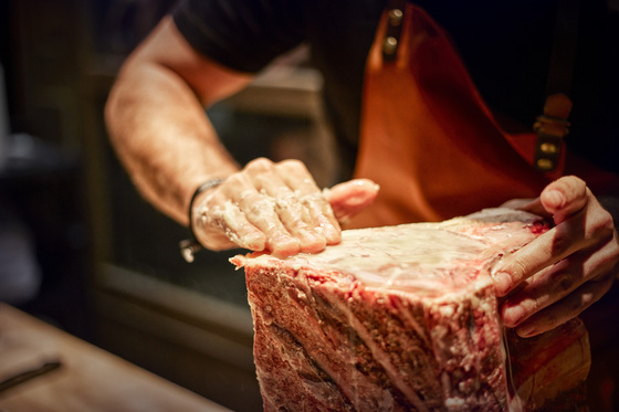 ¿Cómo evitáis la oxidación durante la custodia en cámara? Con la ayuda de una grasa de vacuno que elaboramos nosotros mismos, una mezcla de manteca de ternera, vaca y buey con la que embadurnamos regularmente cada trozo. Una grasa que recomendamos utilizar para cocinar carnes de vacuno a la plancha o al horno.