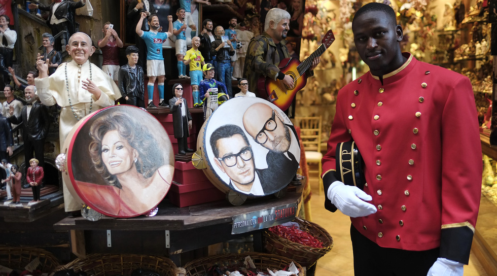 El diseño de una camiseta en la que se estampa una porción de pizza es otro de los guiños a la iconografía italiana, esa con la que a los diseñadores les gusta jugar. Bajo los soportales del patio, Dolce explica cómo conciben la alta costura: “Nos encanta el trabajo a mano, con calma. Por eso nos sentimos muy identificados con la labor del artesano de San Gregorio Armeno”. Gabbana asiente en todo lo que dice su compañero de trabajo desde hace más de 30 años.