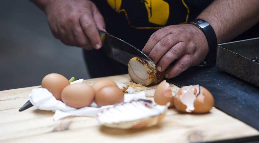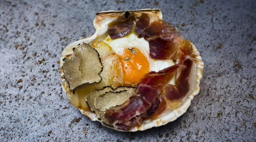 A partir de la concha de una vieira –símbolo del Camino de Santiago–, huevos, jamón, tocino y una trufa de verano, preparamos un plato sencillo y original que Leiro bautiza como el ovo a concha. Encendemos nuestra improvisada cocina con las limaduras de un castaño viejo que acaba de terminar de pulir. “Es algo que hacía hace mucho tiempo en mi estudio, en Cambados: preparaba un fuego con los restos de madera y virutas de después de desbastar las esculturas”, explica. “Y en la ría de Arousa, las conchas las usamos habitualmente para cualquier cosa, porque tienen una forma cóncava que vale tanto para beber como para comer o preparar pintura…”.