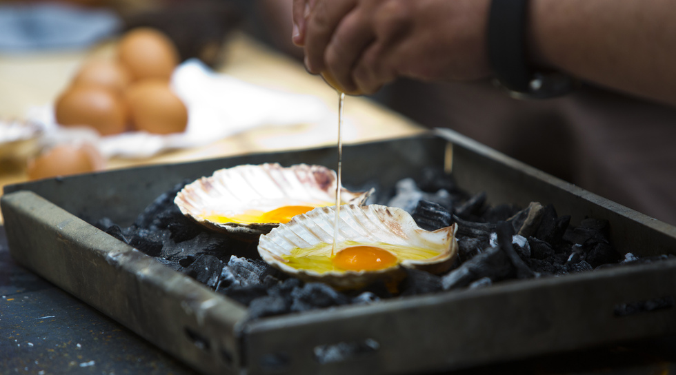- Sobre unas brasas, calentar una cucharada de aceite en las conchas y freír los huevos.