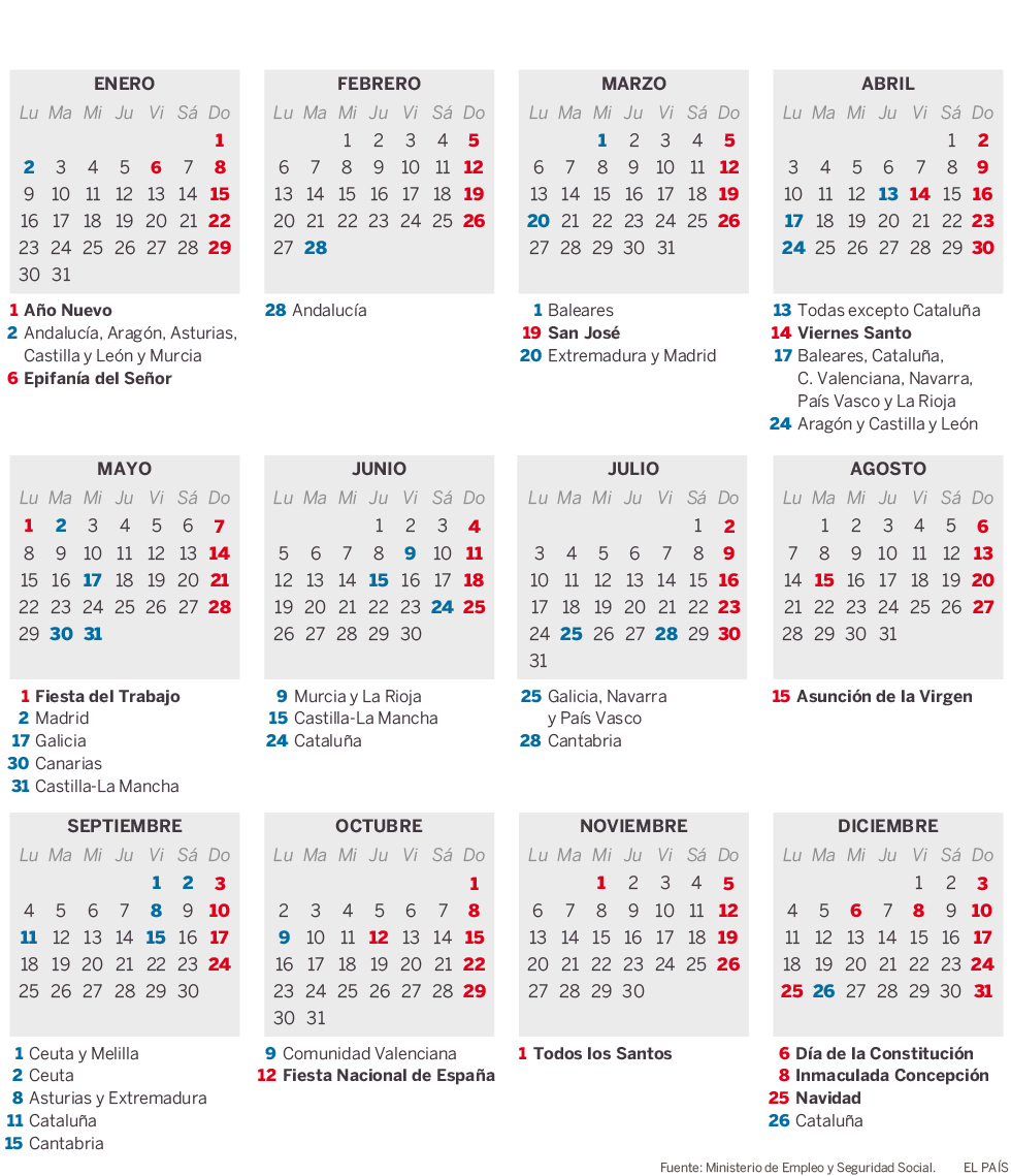 Festivos de carácter nacional y fiestas de todas las comunidades españolas