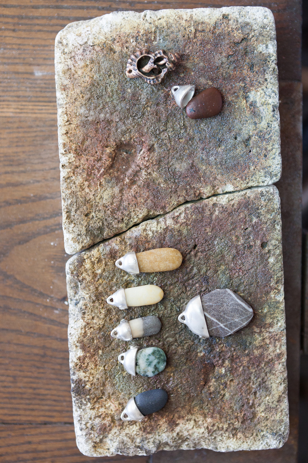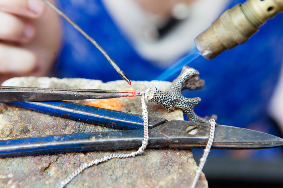 Casi siempre monta las piedras de playa en plata y, en ocasiones, engasta en ellas pequeños rubíes y esmeraldas. Las modela a mano, las suelda, las pule… “Me dicen que debería dedicarme a diseñar y no a tener los dedos destrozados, pero a mí me gusta participar de todo el proceso. Aunque tengo piezas hechas con molde –como las colecciones de percebes o conchas–, lo mío es una firma pequeña y no quiero crecer más. Me gusta recibir a gente que busca que le haga un diseño con una piedra especial que me traen. Valoro mucho esta artesanía y tardar de dos a tres semanas en hacer una pieza es un lujo”.
