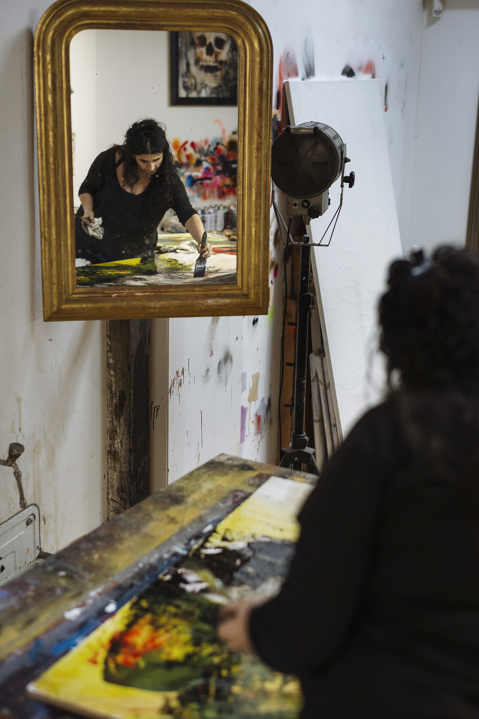 Cabellut ha trabajado durante años con expertos químicos para conseguir en sus lienzos el aspecto craquelado de las pinturas antiguas. Es una variación del fresco que parece dotar a las caras de piel. “En las 12 capas de distintos componentes que uso para lograr mis efectos pictóricos, a veces me apoyo en la proyección y la serigrafía, en técnicas modernas con materiales de diferentes disciplinas. Desde el óleo clásico con aerosoles –nunca acrílicos– y los pigmentos de toda la vida hasta la tira usada en el street art. En fin, soy una rockera de la figuración de hoy, con admiración absoluta por los maestros del retrato”, asegura. Es su homenaje a Velázquez, Goya y Ribera. Y a Rembrandt, el holandés que la atrajo “en busca de un prisma especial de luz”.
