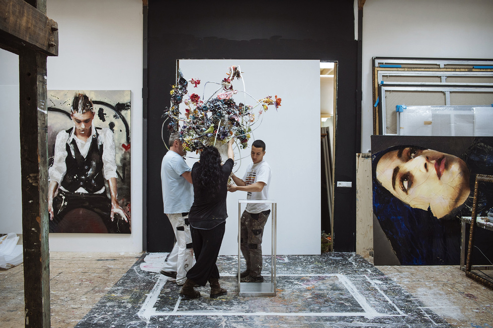 Poseída casi por esas ideas, escribe con su equipo unos ensayos que le ayudan a componer en su cabeza los cuadros. A continuación, llama a sus modelos. “Tengo un grupo de personas que vienen a mi taller; los visto, los coloco de forma adecuada y los fotografío. Cada serie, como la dedicada a la diseñadora Coco Chanel o a la pintora Frida Kahlo, incluye lienzos de gran formato. Por eso tengo dos ayudantes, un joven colombiano y otro polaco, que preparan colores, pinceles y paletas, y mueven mi caballete gigante”.