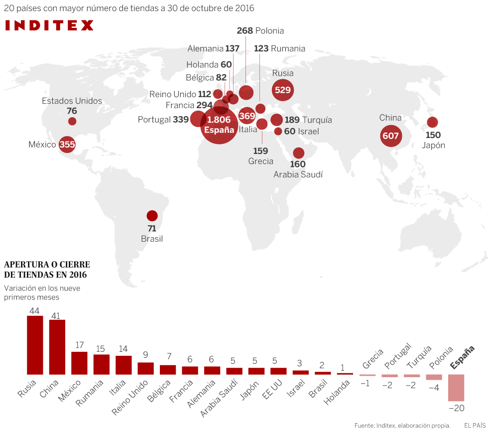 Inditex tiene en el mundo 7.240 comercios. Controla locales de sus distintas cadenas en 93 mercados diferentes. Y parece imparable: solo en los primeros nueve meses de este ejercicio Inditex (que arrancó en febrero de 2016 y terminará en enero de 2017) ha abierto 227 tiendas en 50 mercados. De estas, 144 se inauguraron solo en el tercer trimestre (de agosto a octubre). Aunque ha repartido bastante sus aperturas, el grueso de los nuevos espacios comerciales en los tres trimestres se concentran en Rusia y China. Rusia es una de sus grandes apuestas de los últimos años, y no paró allí su expansión ni siquiera cuando la inestabilidad política y el conflicto con Ucrania llevó al rublo a graves problemas de depreciación. Tiene allí ahora 529 comercios (pasa por primera vez la barrera del medio millar) tras abrir 44 entre febrero y octubre. En cuanto a China, con 41 tiendas más en nueve meses (31 de ellas solo en el tercer trimestre), alcanza las 607 tiendas y pasa así por primera vez la línea de los 600 locales.