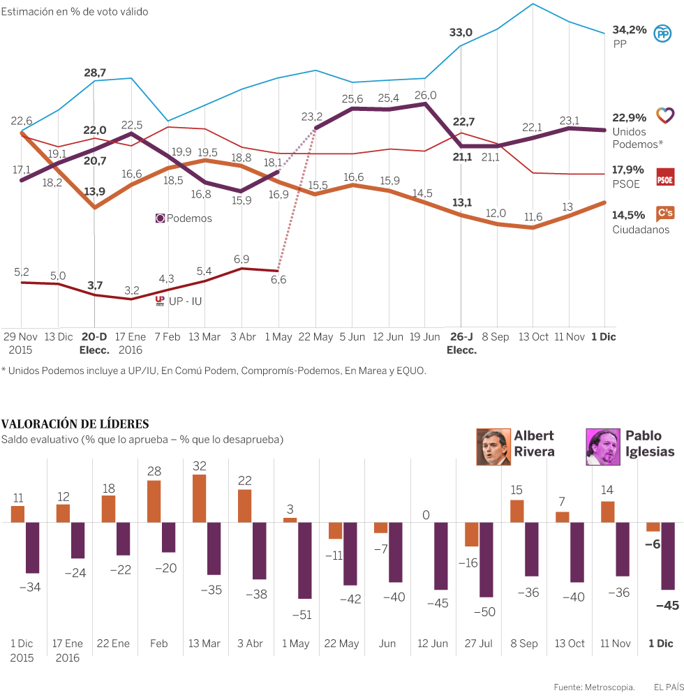 Evolución del voto y de valoración de líderes desde noviembre de 2015 hasta diciembre de 2016