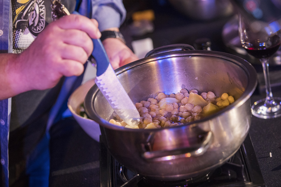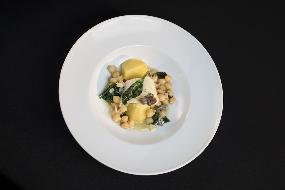 - Verter el sofrito sobre los garbanzos con su caldo y dar unos minutos de fuego lento. Hacer lo mismo con las espinacas. Finalmente, incorporar el bacalao con la piel hacia abajo. Cuando veamos que la piel se desprende en el guiso será el momento de servir.