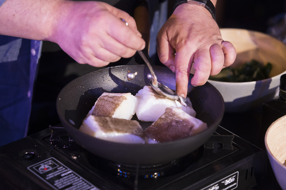 - Marcar los lomos de bacalao en la sartén, primero por la parte de la piel y después por el resto. Colocar en un plato y repartir el jugo sobrante entre el sofrito y las espinacas.