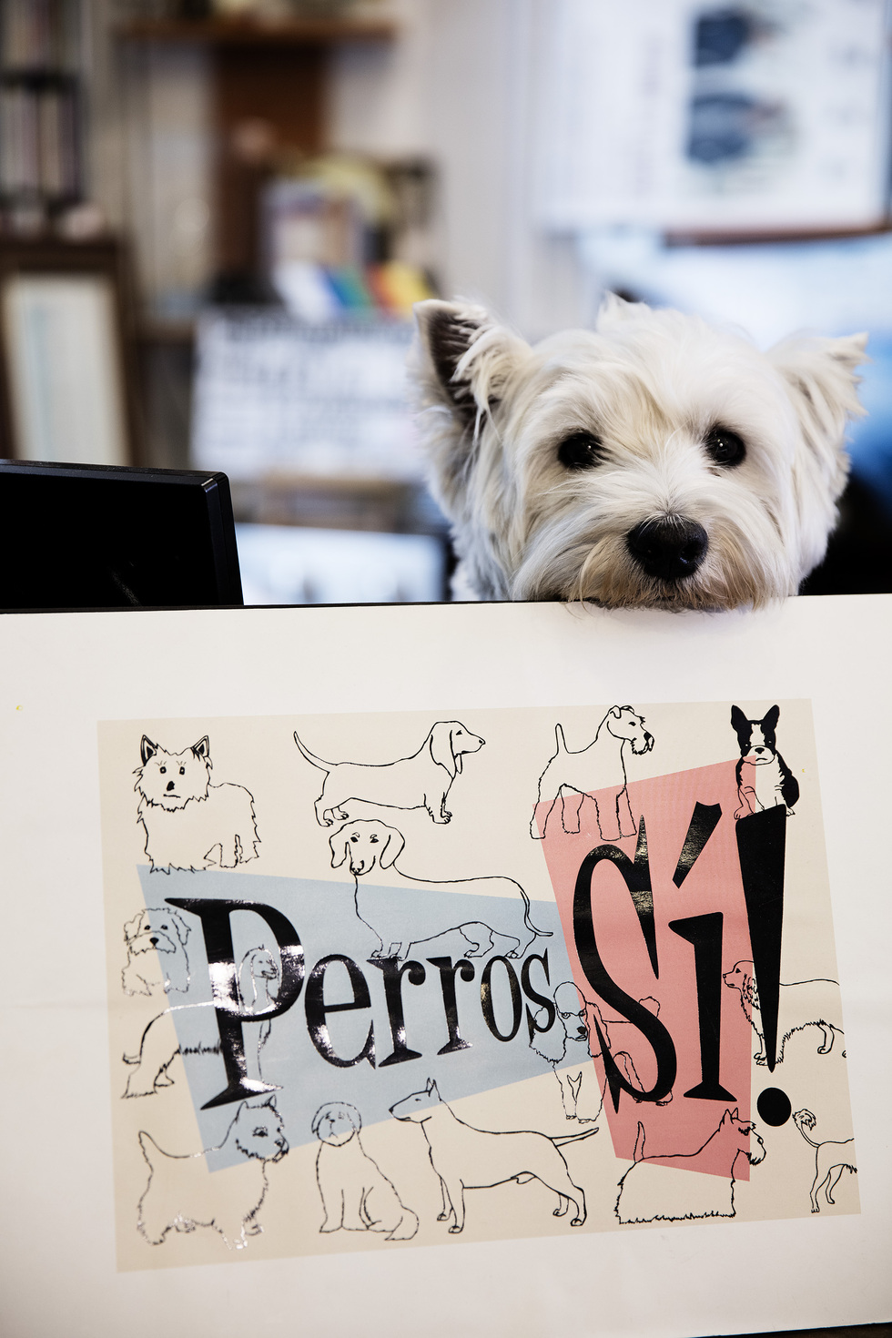 EN LA LIBRERÍA especializada en cine Ocho y Medio, un letrero del artista Juan Gatti dice: “Perros Sí!”. Tras el cartel, un pequeño west highland blanco asoma la cabeza. Es el perro de María Silveyro, propietaria de la tienda madrileña. Se llama Lucas y se lo regaló su difunto marido y socio, Jesús Robles, hace nueve años. “¡Me ha salvado la vida! Desde que murió Jesús –en 2013–, Lucas me cuida y acompaña”. Su hija Begoña ya no vive en casa y el perro acapara su atención. “La gente no lo entiende, pero es como mi hijito”.