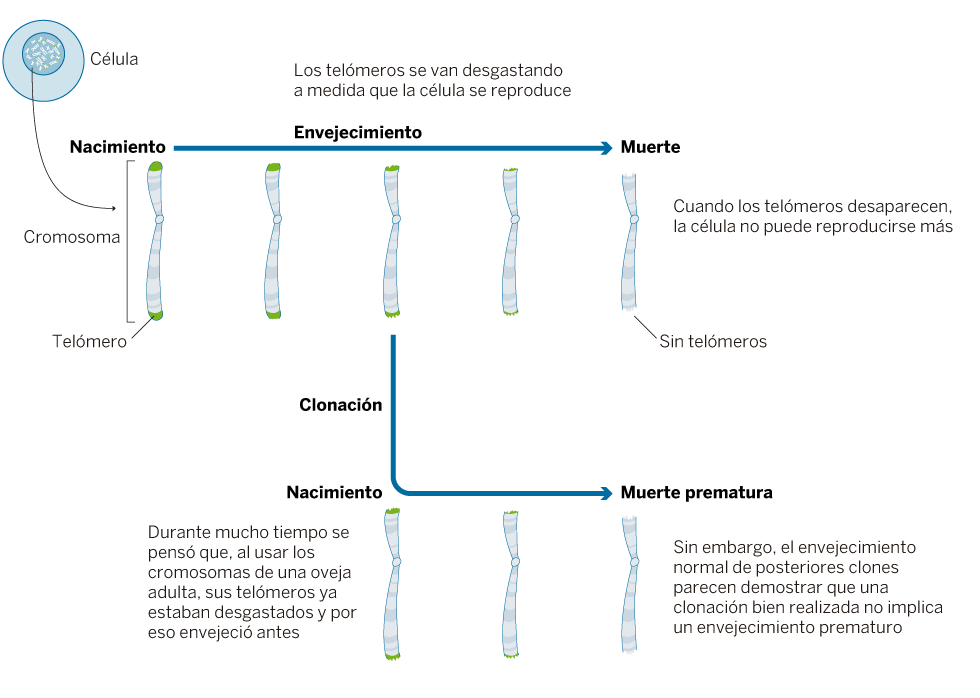 Los telómeros, los extremos de los cromosomas, se desgastan con el paso del tiempo. Durante muchos años se pensó que, al haber usado cromosomas de células adultas, los telómeros estarían ya desgastados, lo que hizo que Dolly envejeciera prematuramente.