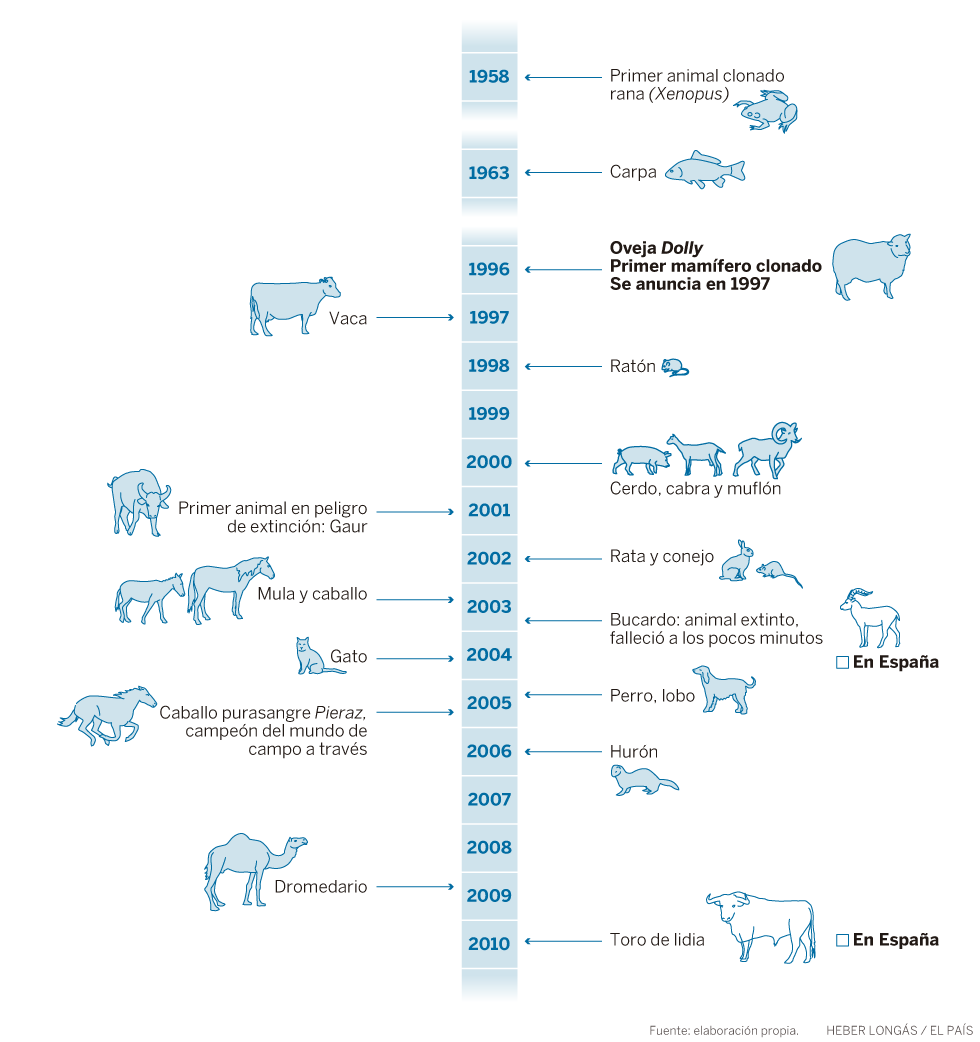 El primer animal clonado, una rana utilizada frecuentemente en investigación, se creó en 1958. Pero pasaron casi 40 años hasta que la técnica estuvo a punto para mamíferos. Después de Dolly, se han clonado muchas especies de mamíferos, en ocasiones para replicar las características de un buen caballo de carreras o para intentar resucitar a una especie extinta