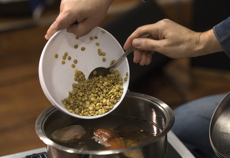 Quedamos en un estudio de grabación de las oficinas de Warner Music en Madrid y montamos una cocina encima de un estuche vacío de instrumentos. Sentado en un sofá de cuero marrón, el compositor cuenta que fue su abuelo Ramón, un onubense que dejó las minas de Riotinto para buscarse la vida en la capital, el que le enseñó a preparar este potaje de invierno. “Eran otros tiempos, macho. La cocina eran momentos que pasabas con la familia. Y si no te gustaba lo que había hecho tu vieja, te ibas a casa de la vecina porque te había llegado un olor exquisito. Ahora apenas hablamos con los que viven en nuestro edificio”, cuenta con esa continua mezcla en su discurso que va del clamor melancólico a la rebeldía constante, una explosiva combinación de palabras que no todo el mundo puede (o sabe) digerir. Pero que a él le importa un comino, esa especia que siempre le gusta añadir a las lentejas.