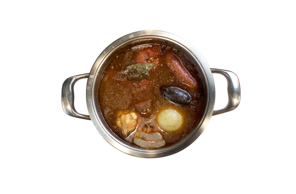 4. Cuando comience a hervir, incorporar el hueso y la punta de jamón, el tocino, el chorizo, la morcilla y una hoja