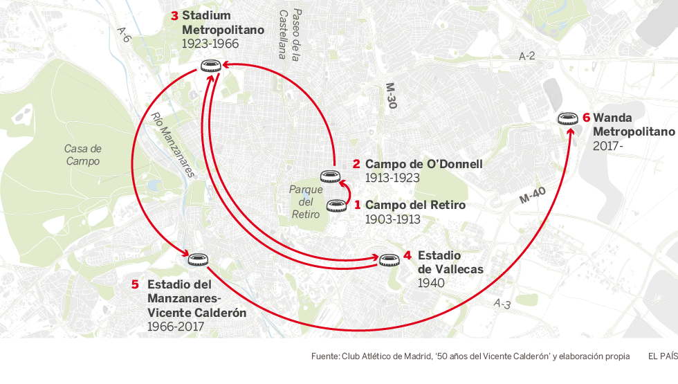 El Atlético de Madrid ha ocupado hasta cinco estadios en la capital en sus más de 100 años de historia. El primer campo donde jugó estaba en Ronda de Vallecas, después se trasladaron al campo de O'Donnell, también en el distrito de Retiro. En 1923 se mudaron al Stadium Metropolitano que se convertiría en su sede durante más de 40 años con un paréntesis en la Guerra Civil. Ya en los años 60 se comienza a jugar en el Manzanares, posteriormente, Estadio Vicente Calderón.