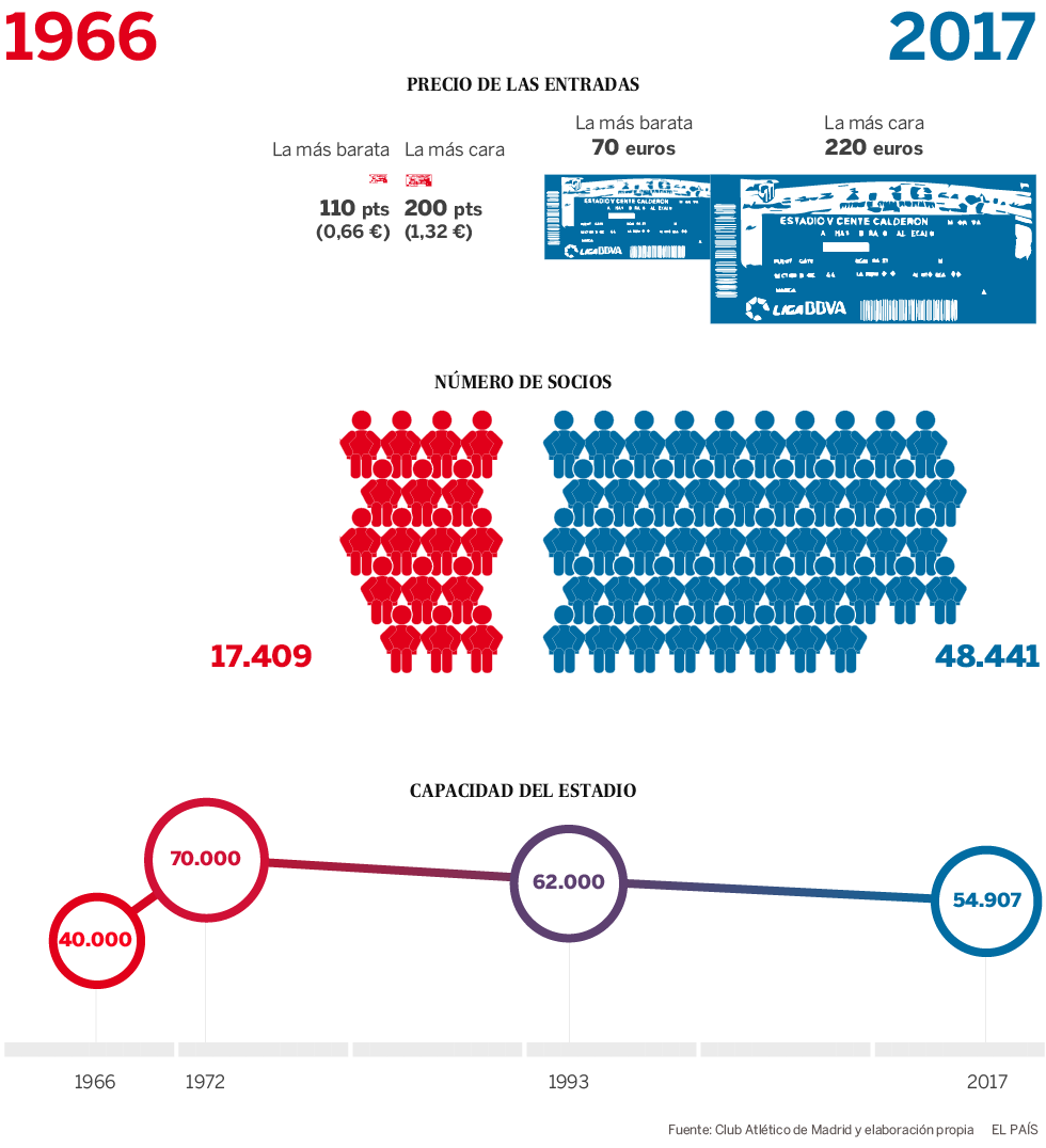 La plantilla del primer equipo es más numerosa y juegan más minutos cincuenta años después. En aquella temporada 1966-1967 el Atlético contaba con 23 jugadores en su plantilla, de la que Luis Aragonés era su máximo goleador, con 19 tantos anotados. En esta temporada, 27 jugadores han disputado algún minuto con el equipo rojiblanco y Griezmann es el pichichi del equipo con 25 goles en todas las competiciones.
