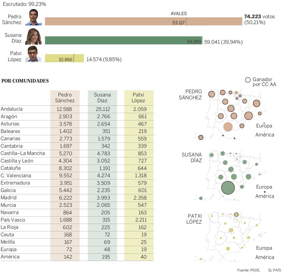 Votos conseguidos por Pedro Sánchez, Susana Díaz y Patxi López y distribución por comunidades