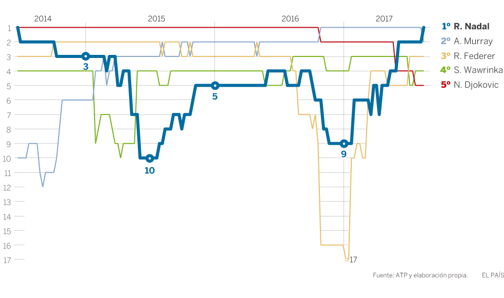 En julio de 2014, tras ser eliminado en cuarta ronda de Wimbledon, Rafa Nadal deja de encabezar la clasificación de la ATP en detrimento de Novak Djokovic, que continuaría como número 1 durante más de dos años. Mientras tanto, el tenista mallorquín llegó a descender hasta el décimo puesto tras diferentes lesiones y dudas sobre su juego y su estado anímico. Desde finales del año 2015 hasta 2016 se mantiene rondando el puesto 5 con una temporada bastante irregular. En agosto, tras los Juegos Olímpicos de Río, Andy Murray desbanca a Djokovic de la cabeza del ránking y, en pocos meses, Nadal vuelve a descender hasta el puesto 9.