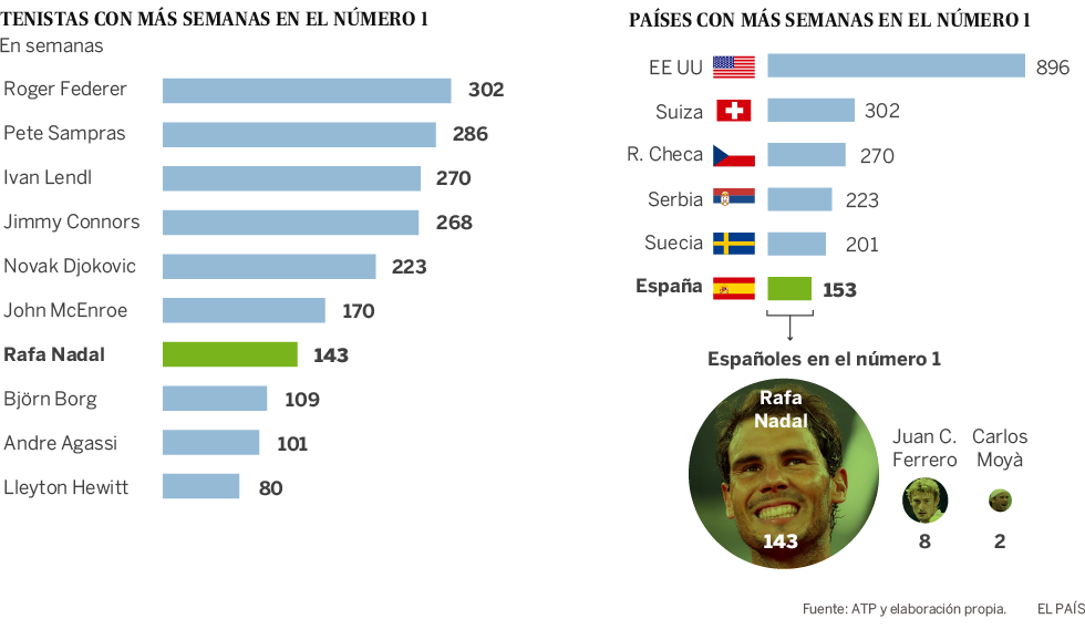 Roger Federer es el tenista que más semanas ha estado en el número 1 de la ATP, con más 300 semanas, 237 de ellas de manera consecutiva (algo más de cuatro años y medio). De los 10 tenistas con más tiempo encabezando la lista sólo el suizo, Djokovic y Nadal continúan en activo. El balear ocupa actualmente el séptimo puesto del ránking con 143 semanas en cabeza (56 de ellas consecutivas). Entre los países con más tiempo en el número 1, Estados Unidos está en cabeza con 896 semanas, repartidas entre seis tenistas. Suiza es el segundo país que más semanas ha encabezado la clasificación, pero todas ellas han sido Roger Federer. Los españoles han estado al frente del ránking durante 153 semanas, en las que han estado, además de Nadal, Juan Carlos Ferrero, durante 8 semanas, y Carlos Moyà, otras dos.