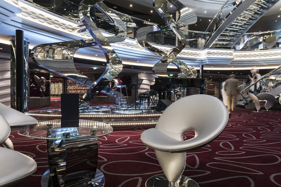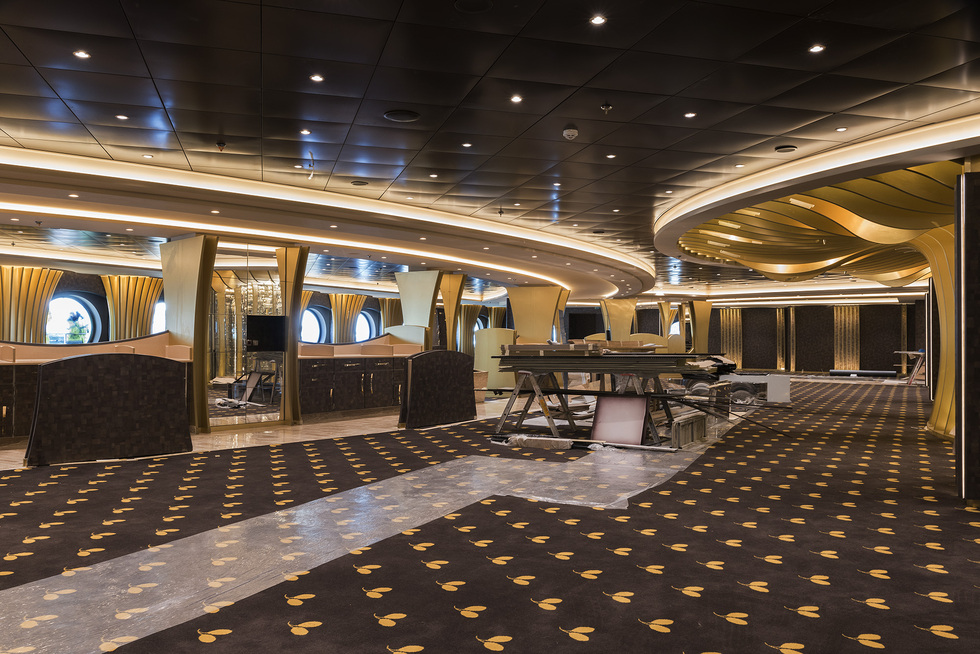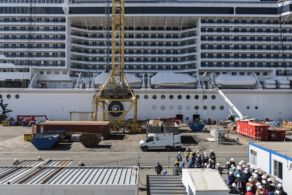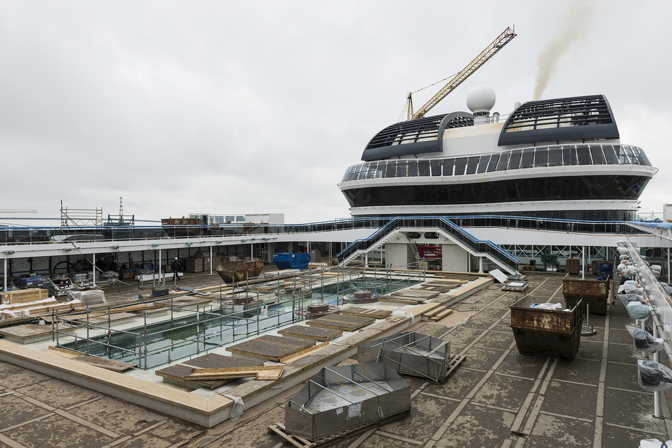 Finales de marzo de 2017. La terraza de la cubierta donde estas señoras saborearán su ansiado cóctel es un auténtico caos. Un enjambre de cables, sacos de cemento, tablas de madera y muebles sin colocar. Miles de operarios trabajan a pleno rendimiento para rematar las obras del Meraviglia. Esta megaconstrucción naval de 315 metros de eslora, 43 metros de manga y 65 de alto se ha levantado en uno de los diques del astillero de Saint-Nazaire, en la Bretaña francesa. Los altavoces del buque repiten la misma frase cada cinco minutos: “Attention: un, deux, trois, quatre”. Las pruebas de sonido no parecen molestar a los pintores, carpinteros, electricistas, ingenieros, operarios de grúa, fontaneros y demás empleados que trabajaban en las obras. En la galería central, que albergará restaurantes, tiendas de lujo y diferentes bares, se escuchan una decena de taladros agujereando al unísono, acompañados por el estruendo de las lijadoras y los gritos del compañero del andamio pidiendo más pintura. Aquí lo único realmente acabado es el techo, cubierto por una pantalla gigante de luz led que recreará un cielo digital. De música de fondo, reguetón. Ritmo bien duro para cumplir con el plazo de entrega: el 31 de mayo. Lo que sí está ya instalado es la escalinata de cristales de Swarovski de la recepción. Cualquier excentricidad es poca en la pugna para proclamarse el auténtico rey de los mares y atraer al mayor número de cruceristas. Un tipo de viajero que demanda mucha diversión a bordo, que quiere visitar diferentes ciudades sin tener que acarrear maletas y pagar precios asequibles.