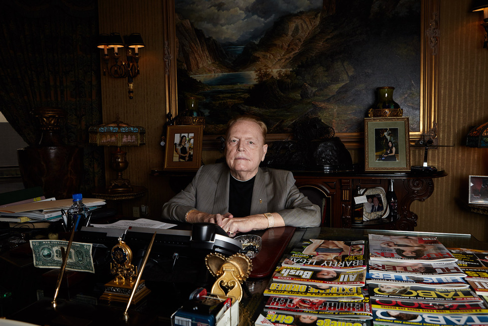 Larry Flynt creció siendo pobre de solemnidad en Kentucky. Su ascenso hasta este despacho de oro de Beverly Hills comenzó con un bar a finales de los sesenta en Ohio. Al bar se le añadieron camareras desnudas. En pocos años había convertido el garito en una cadena de clubes de striptease llamados Hustler (golfo). Flynt empezó entonces a distribuir un boletín entre los clientes sobre las chicas de sus clubes. El boletín acabó convertido en una revista porno, Hustler, en 1974. La publicación se hizo famosa en el verano de 1975, cuando desveló unas fotos robadas a Jacqueline Onassis desnuda en una piscina. A partir de ahí, Flynt se convirtió en una autoridad en el mal gusto. Su revista mostraría las fotos más explícitas y los chistes más ofensivos de la floreciente industria de publicaciones y cine porno de la época. Llovieron las denuncias. En 1978 recibió un disparo de un supremacista blanco a la puerta de uno de esos juicios. Está parapléjico en una silla de ruedas desde entonces. En medio de la espiral de drogas en la que se metió en los años siguientes, pasó seis meses en prisión por presentarse en un juzgado con la bandera de Estados Unidos a modo de pañal. Su esposa y cofundadora de Hustler, Althea, falleció de sida en 1987. Un retrato de ella sigue presidiendo la sala de juntas de Flynt Publications.