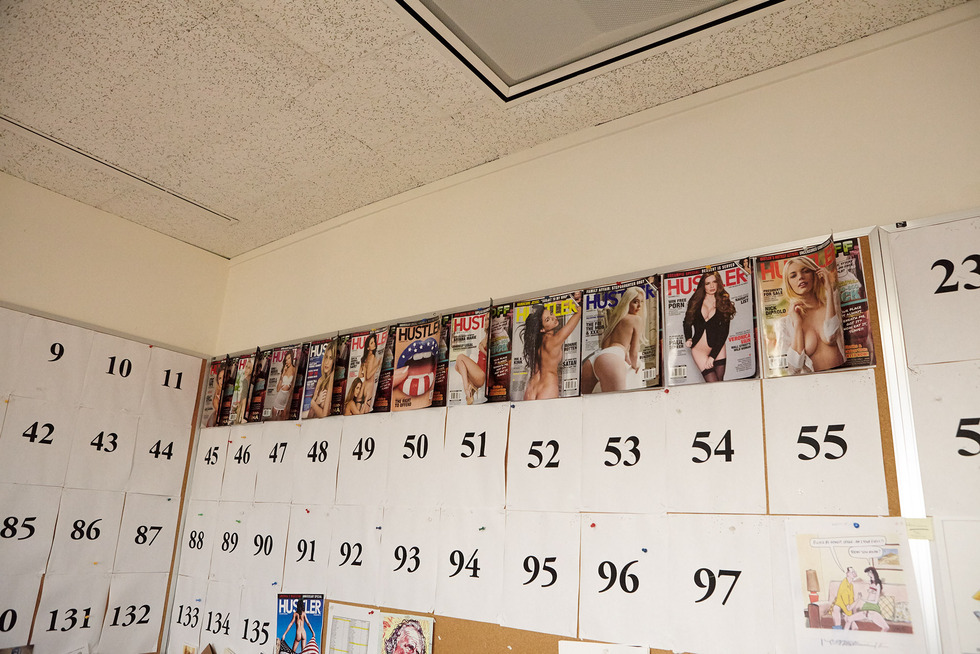Flynt recibe a El País Semanal en un despacho enorme con amplias vistas de las montañas de Los Ángeles (California) y una decoración indescriptible. Es la esquina norte de la planta 10ª de un edificio de oficinas marrón con las letras LFP (Larry Flynt Publications) en la milla de oro de Beverly Hills. A la entrada de la calle hay una estatua de John Wayne a caballo con un relieve que representa el entierro del cowboy como si fuera una escena bíblica. A un lado, encima de un caballete, reposa el libro gigante de la editorial Taschen sobre desnudos de Helmut Newton. Encima de un escritorio del tamaño del que preside el Despacho Oval se acumulan cartas y ejemplares tanto de la revista Hustler como de la competencia. Un clip sostiene un billete de dólar en el que pone “9-11” (por los ataques del 11 de septiembre). La película sobre su vida se filmó en estas oficinas. El cineasta Milos Forman decidió que no tenía sentido intentar replicar en un estudio el delirio rococó donde trabaja el magnate, rodeado de porcelanas, cornucopias, molduras doradas y muebles palaciegos. Cada noche, al acabar el trabajo en las oficinas de Flynt Publications, el equipo de la película tomaba la planta entera para rodar en el escenario real.