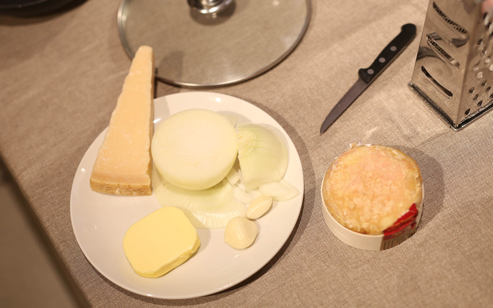 Picar la media cebolla finamente. Fundir la mantequilla en una cazuela y pochar en ella la cebolla.