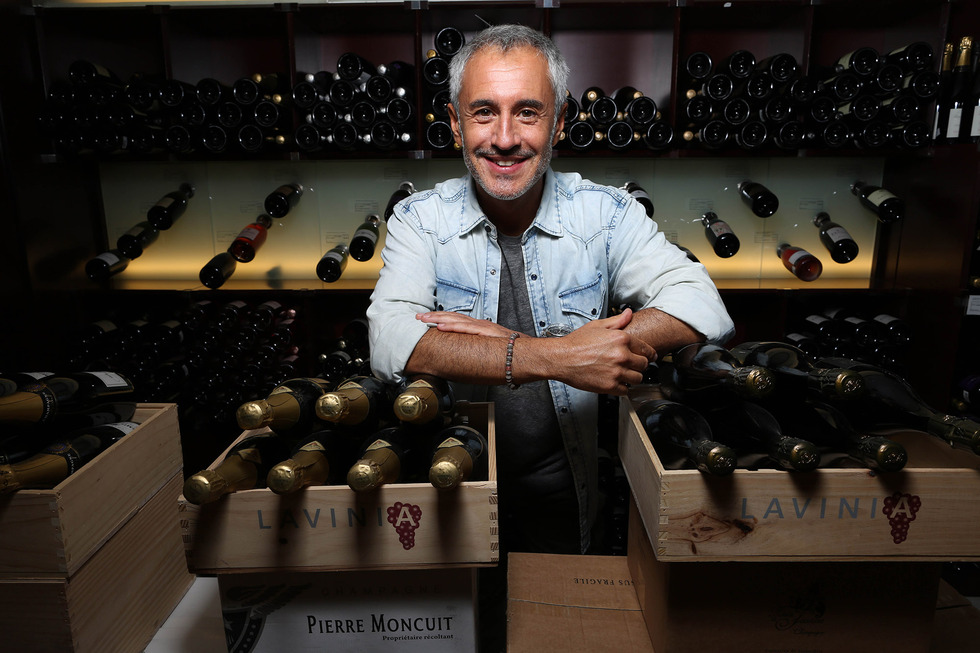 Su voz inconfundible va ganando en matices con el paso del tiempo, como los grandes vinos. Así que no es de extrañar que esta bebida le haya acompañado en algunos de los momentos más importantes de su vida: desde las tensas horas previas a un concierto multitudinario hasta la intimidad del hogar, compartiendo algún plato con sus seres queridos. “Cuando tengo el típico día gris, que me levanto y estoy insoportable, digo: ‘Mira, ¿sabes qué? Me voy a la tienda de vinos y me hago un regalo”, relata divertido. El regalo hoy lo recibo yo, que puedo presumir de la compañía y la conversación de Sergio Dalma, el más italiano de todos los cantantes españoles. Con tales antecedentes, no es de extrañar ni la receta que cocinamos —un risotto servido en una untuosa torta del Casar, a modo de fusión de los sabores de los dos países— ni el lugar en el que nos reunimos, la muy surtida vinoteca madrileña Lavinia.