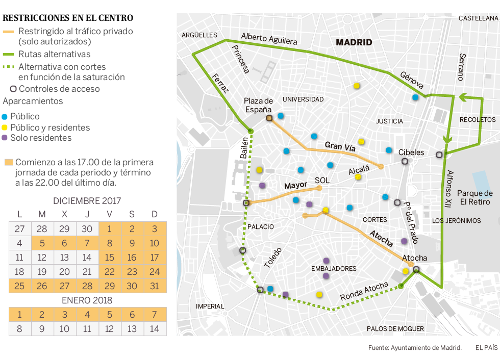 El plan 'Operación Navidad' incluye cortes en los ejes de Gran Vía, calle Mayor y calle de Atocha durante 28 jornadas desde el 1 de diciembre al 7 de enero. Durante estos días solo los residentes, vehículos de personas con movilidad reducida y otras excepciones podrán acceder a las zonas restringidas. También se permite el acceso a los 36 aparcamientos que hay en la zona.