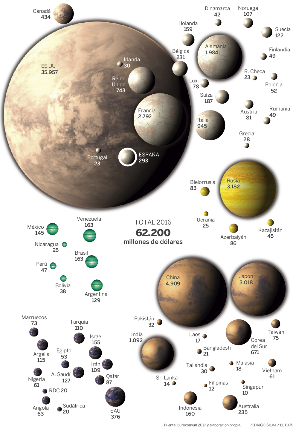 Millones de dólares (2016). Solo se indican países con al menos 10 millones de dólares de presupuesto.