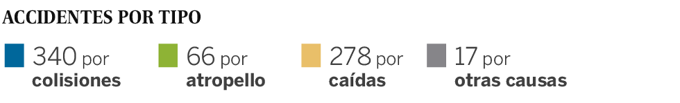 El análisis de la detallada información sobre accidentes de bicicleta en la capital (701 entre enero y noviembre de 2017) que ofrece el Ayuntamiento de Madrid permite saber exactamente dónde se producen los siniestros —más de la mitad, en la almendra central; uno de cada cinco en el distrito Centro—, pero también cuándo —las franjas horarias con mayor incidencia son de 19.00 a 21.00 (el 17,8%) y de 13.00 a 15.00 (otro 15%).— y de qué manera: el 48% son colisiones de bicis con otros vehículos. La estadística no ofrece, sin embargo, dato alguno sobre heridos, pero un portavoz de la Policía Municipal ofrece los números globales: 605 heridos leves, 50 graves y un fallecido. Aunque las cifras, por no ser de año completo, no se pueden comparar con 2016 y 2015, los porcentajes de unos y otros son muy parecidos, incluido el 10% de accidentados que suele salir ileso.