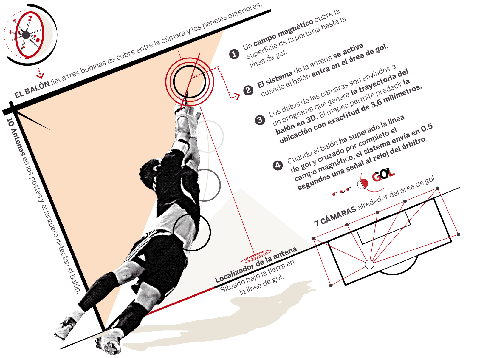 El fin de los goles fantasmas es posible gracias a que la ubicación exacta en 3D del balón se calcula continua y automaticamente por triangulación, incluso si sólo es visible desde dos cámaras.