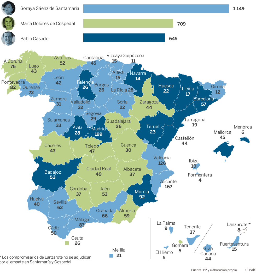 Simulación sobre los compromisarios que correponderían a cada candidato si sumaran todos los delegados de las provincias en las que han ganado. Se excluyen los 101 compromisarios que eligen Nuevas Generaciones.