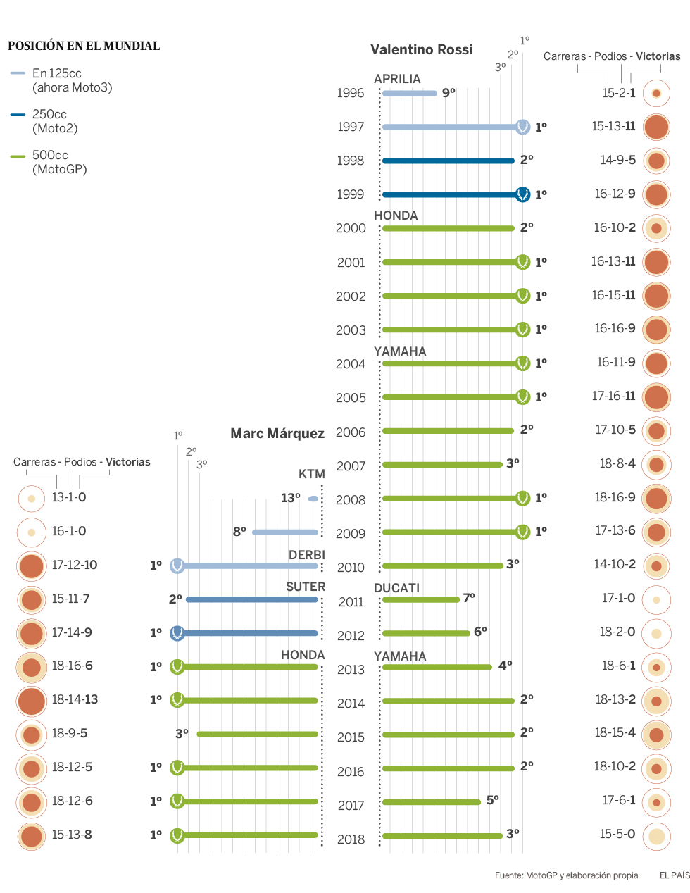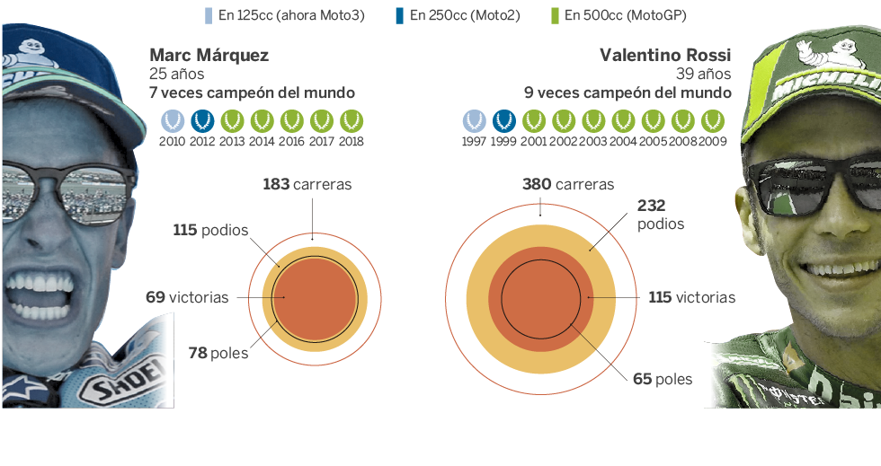 Valentino Rossi debutó en el Mundial de Motociclismo en 1996 con 17 años. Se estrenó con una Aprilia, marca con la que ganó su primer Mundial, de 125cc, al año siguiente. En las temporadas posteriores se hizo con los títulos de 250cc y de 500cc (luego MotoGP) y se erigió como el gran referente del motociclismo. Ganó con Honda y también con Yamaha. Cuando Marc Márquez se subió por primera vez en una KTM de 125cc, en 2008, el italiano ya era una leyenda. Hoy cuenta con siete campeonatos del Mundo de la categoría reina y ve cómo aquel chaval se le acerca a gran velocidad. En los cinco años que pasó en las categorías inferiores Márquez consiguió también dos títulos: uno en 125cc (en 2010) y otro en Moto2 (2012), justo antes de dar el salto. Ganó su primer Mundial de MotoGP el año de su estreno en la categoría. Desde entonces, ha sumado cinco mundiales con Honda; Rossi, de vuelta a Yamaha tras dos malos años en Ducati, ha quedado segundo en tres ocasiones pese a ser el más veterano de la parrilla.