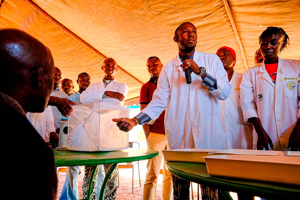 La obra forma parte de una ofensiva mucho más amplia. Ese mismo día, Target Malaria había invitado a más de 100 habitantes de la zona a la granja de insectos de Bobo-Dioulasso. Siete científicos del IRSS les enseñaron mosquitos en diferentes fases de su ciclo de vida, desde pequeñas larvas hasta adultos capaces de picar, y les explicaron su trabajo. Después de la visita, los invitados les hicieron diferentes preguntas. Uno quería saber si los insectos modificados genéticamente eran inofensivos y no iban a dejar estériles a las mujeres, y otros por qué el proceso está siendo tan largo.