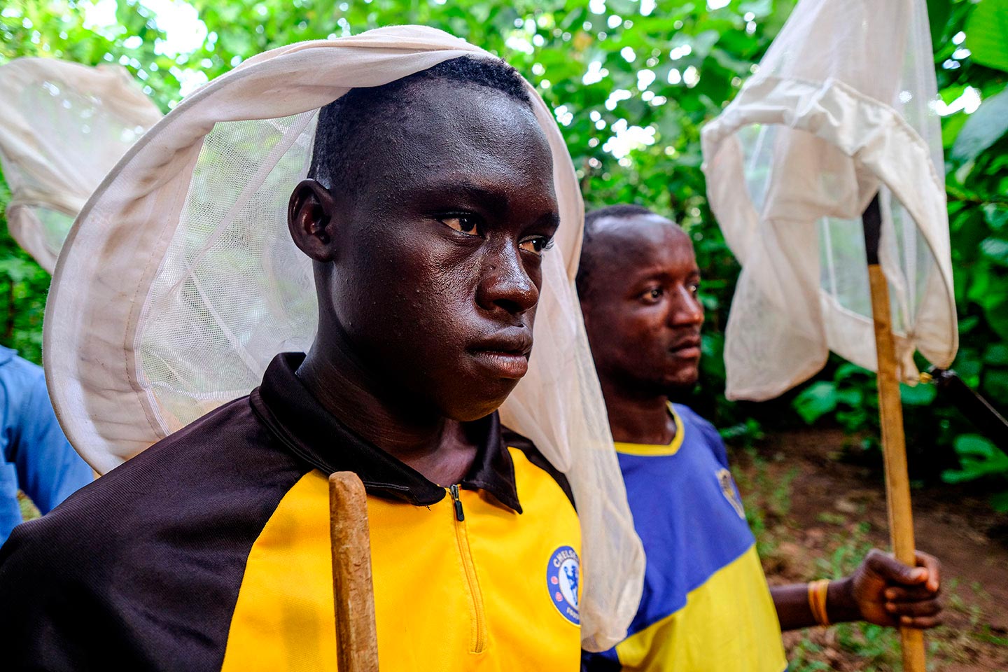 Cuando ya hay suficientes mosquitos revoloteando, los hombres contratados por Target Malaria empiezan a sacudir enérgicamente las redes adelante y atrás.