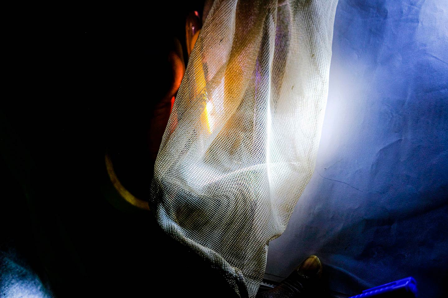 Los hombres alumbran las redes con linternas y consiguen la captura del día: al menos 10 mosquitos zumban alrededor.