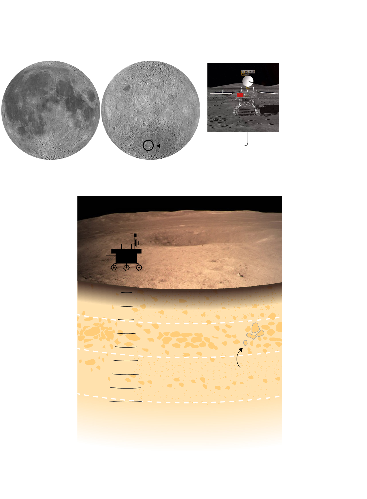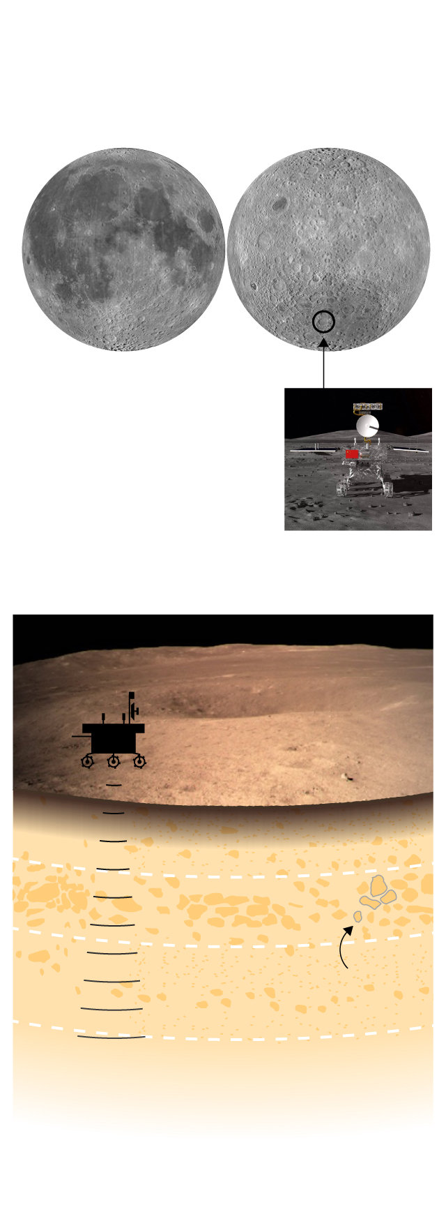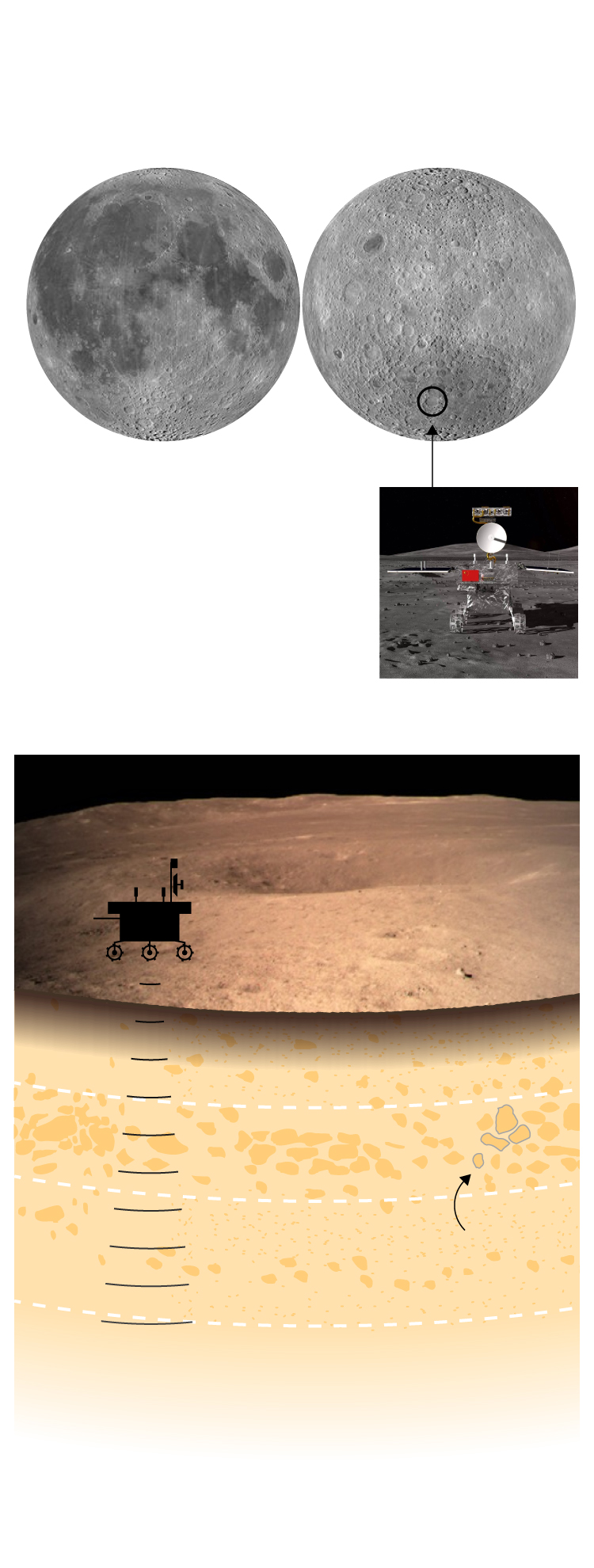 El radar muestra que el interior de la cara oculta de la Luna está hecho de una primera capa de terreno muy fino que llega hasta los 12 metros de profundidad. Son viejas rocas literalmente machacadas por la lluvia de meteoritos y el efecto de la radiación solar. Esta composición ha facilitado que las ondas del radar penetren mucho más que en la cara visible, donde otro robot chino hizo el mismo experimento alcanzando una profundidad de solo 10 metros. Debajo de esa primera capa hay un segundo nivel que alcanza hasta los 24 metros y donde aparecen grandes rocas de entre medio metro y dos metros de largo. Más abajo y hasta donde han podido llegar las ondas del radar —unos 40 metros— hay terreno más mezclado con capas de tierra fina y rocas.